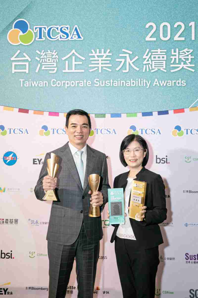 达在台湾永续奖所评比环境、、社会、、、治理等各面向的永续绩效均获高度肯定 (左:人生就是博光电总经理暨营运长柯富仁,,,,右:人生就是博光电永续长古秀华)