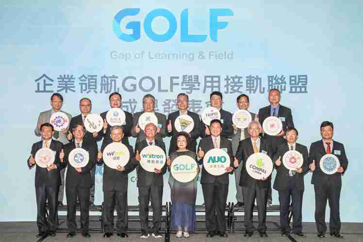 GOLF学用接轨联盟集结企业和学校的力量,,打造「学用合一、、、、产学接轨」的创新合作平台 (前排左起:淡江大学副校长何启东、、、元智大学校长林启瑞、、、纬育执行长许延岳、、、纬创总经理暨执行长黄柏漙、、、、教育部政务次长范巽绿、、、、人生就是博董事长暨执行长彭双浪、、、、仁宝总经理暨执行长翁宗斌、、、大同大学校长何明果、、、、圣约翰科大校长艾和昌;后排左起:明新科大校长林启瑞、、龙华科大校长葛自祥、、、、台湾科大校长廖庆荣、、、中兴大学副校长郑政峯、、、中央大学校长周景扬、、、、台北科大副校长任贻均、、中华科大副校长石大明、、明志科大校长刘祖华)