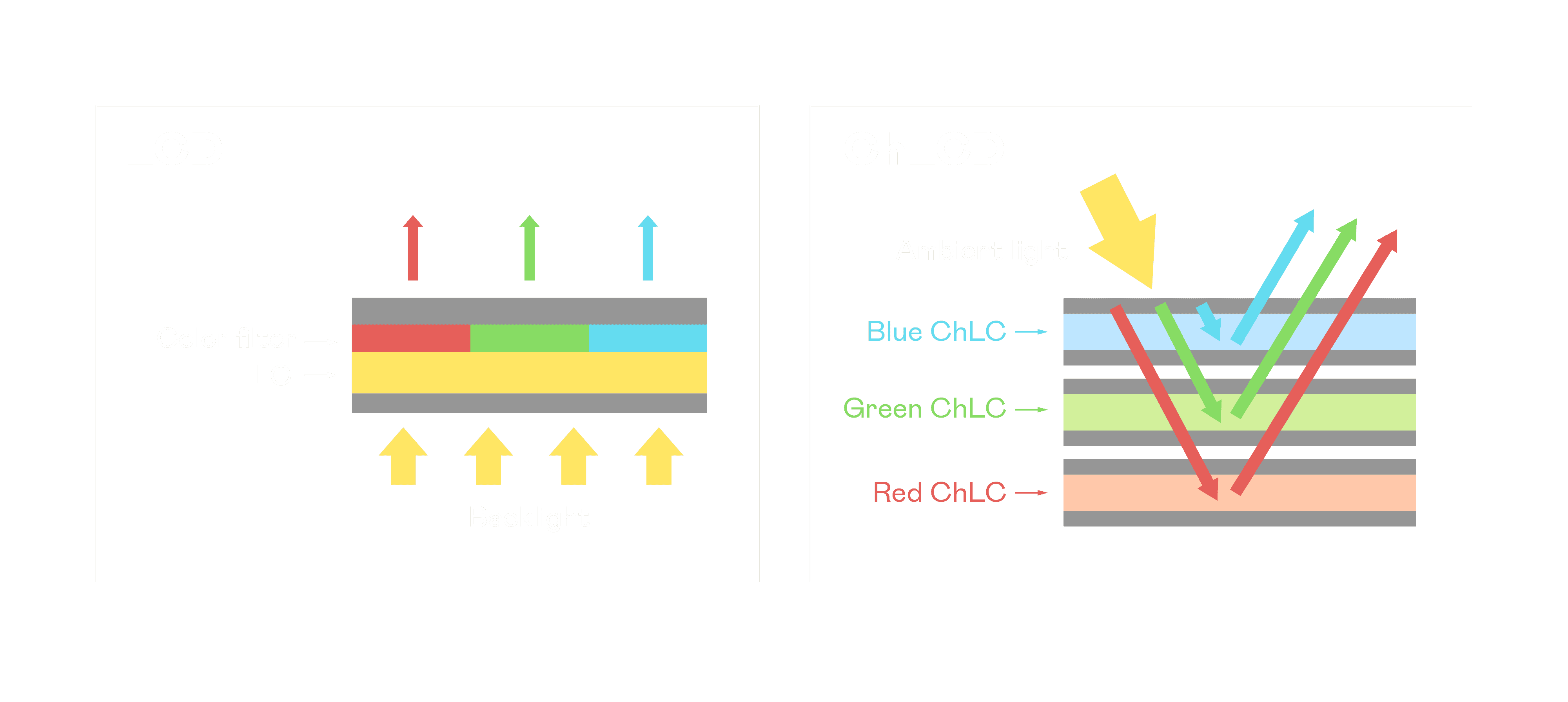 ChLCD 胆固醇液晶就如同纸张一样,,,透过反射环境光来显示影像,,,因此长时间观看不易造成人眼视觉疲劳,,,,可达到护眼效果。。当处于户外阳光下使用,,LCD 影像容易失真而不易观看,,,,但胆固醇液晶仍可维持较佳的影像品质。。